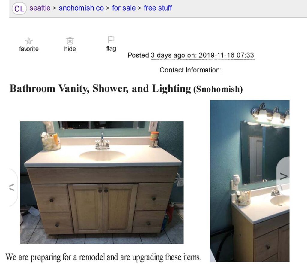 If you’re interested in finding someone to take your construction debris or unwanted items like an old sink or toilet, we suggest taking a photo of it before it’s removed. A short description of the item with the sizes and letting people know it works is also helpful. Experience has taught us that posts with phone numbers do tend to get a quicker response. That said, if you don’t want to be bothered by calls, you can just use the anonymous email system provided by craigslist. Either way, you can remove your post once the items are gone.